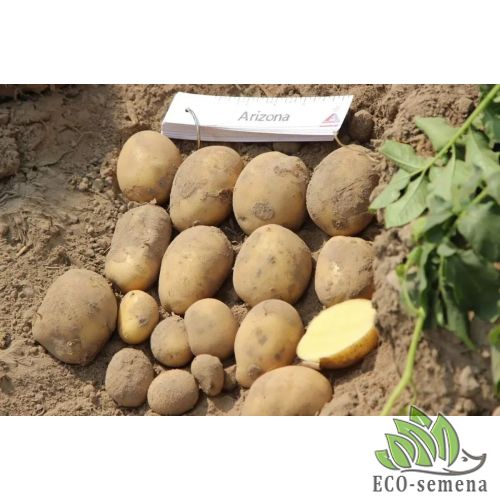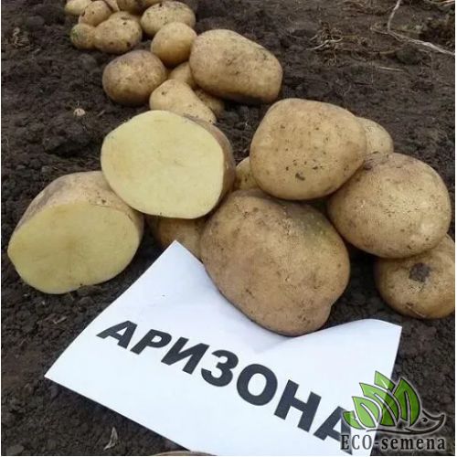 Картофель Аризона - выведен нидерландской селекционной компанией Agrico, и относиться к группе высокоурожайных раннеспелых сортов. Он по праву считается одним из лучших среди сортов столового назначения благодаря своим вкусовым качествам. Период созревания составляет 70-80 дней. В процессе роста формируется от 12 до 15 клубней (110-150 грамм) овальной формы светло-желтого цвета. Кожура гладкая с малозаметными поверхностными глазками. Благодаря устойчивости к болезням, вирусам и засухоустойчивости имеет очень высокие показатели урожайности даже в сложных условиях роста.