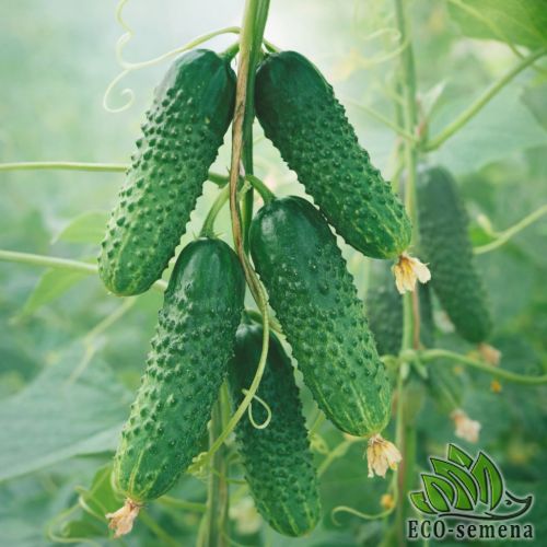 Плоды темно-зеленые, выровненные, с мелкими бугорками и плотной хрустящей мякотью без горечи. Идеально подходит как для свежего употребления, так и для засолки и консервации.