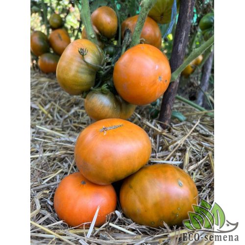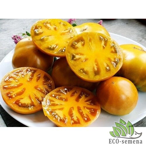 Томат Гном Сияние Вавилона - новый чудо-сорт селекции Блейна Хортона из США, среднеспелый, урожайный. Растение карликового типа, 0,8–1 м, компактное, с морщинистыми тёмно-зелёными листьями, можно выращивать в ограничённом объёме почвы, в частности, в горшках, вазонах, на балконах. Плоды различной формы – овальной, овально-сердцевидной, некоторые ближе к плоскоокруглым. Очень красивые, оранжево-бронзовые с зелеными полосками, мякоть тоже оранжево-бронзовая, словно светится изнутри. Масса плодов составляла 80–200 г, по описанию сорта – до 300 г. Структура плодов маслянистая, они очень вкусные, сладкие, с легкой кислинкой и вкусом и ароматом экзотических фруктов. Сорт-любимец! Новый чудо-сорт селекции Блейна Хортона из США, среднеспелый, урожайный. Растение карликового типа, 0,8–1 м, компактное, с морщинистыми темно-зелеными листьями, можно выращивать в ограниченном объеме почвы, в частности, в горшках, вазонах, на балконах. Плоды различной формы – овальной, овально-сердцевидной, некоторые ближе к плоскоокруглым. Очень красивые, оранжево-бронзовые с зелеными полосками, мякоть тоже оранжево-бронзовая, словно светится изнутри. Масса плодов составляла 80–200 г, по описанию сорта – до 300 г. Структура плодов маслянистая, они очень вкусные, сладкие, с легкой кислинкой и вкусом и ароматом экзотических фруктов. Сорт-любимец!