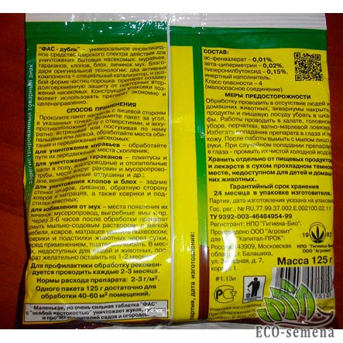 Универсальный контактно-кишечный инсектицид Фас-дубль применяется для дезинсекции объектов различной категории: жилых, производственных, складских помещений, пищевых и медицинских учреждений, террас, дачных и приусадебных участков против всех видов тараканов, муравьев, а также клопов, блох, моли, мух. Средство содержит в составе токсичную для насекомых концентрацию действующего вещества - ацетамиприда. Активный компонент проявляет сильное парализующее действие как при наружном контакте, так и при попадании в пищеварительную систему вредителей и нарушает процессы передачи нервных импульсов, вызывая паралич и гибель насекомых. Синатропгые насекомые охотно поедают порошок, благодаря наличию пищевого привлекателя, и несут его в свои гнезда, в результате чего уничтожается вся колония насекомых.
