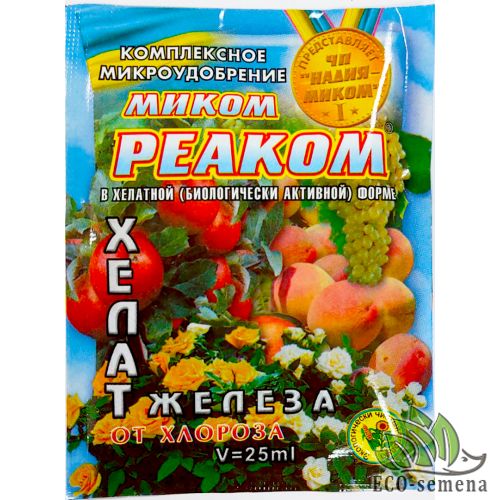Микроудобрение Реаком Хелат Железа (25 мл) - высокоэффективное экологически чистое микроудобрение, на основе хелатов микроэлементов, для профилактики и борьбы с хлорозом (железной недостаточностью) у плодовых, ягодных, овощных, декоративных, полевых культур и виноградников.